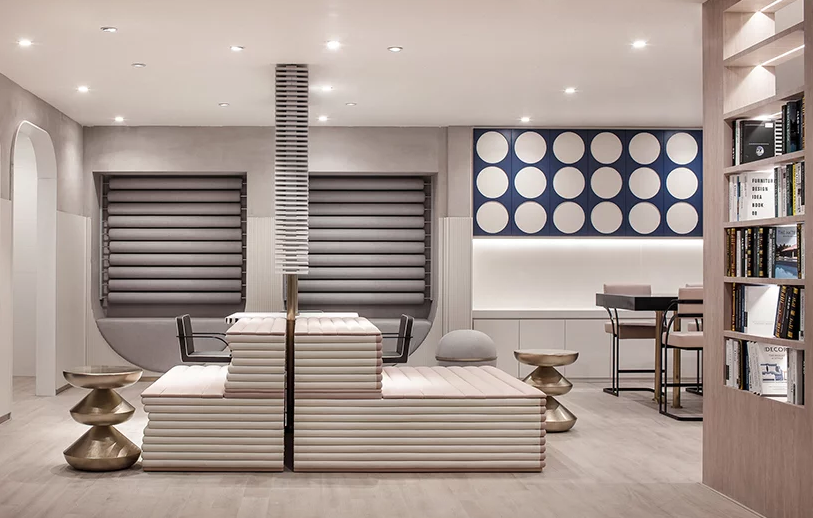 三樓是針對(duì)年輕群體的小型工作空間。從大堂乘坐自動(dòng)扶梯到達(dá)3樓后,首先會(huì)有人在展示窗口上用“努力工作”的字眼表示歡迎。x + living利用空間中的健身器材元素來(lái)傳達(dá)保持健康和工作之間平衡的想法。設(shè)計(jì)融合了有趣的特色,如開放式酒吧區(qū)和前臺(tái)側(cè)面的休閑球池。穿過接待區(qū),人們將來(lái)到共用會(huì)議室和電話亭形的休息室。會(huì)議室采用簡(jiǎn)約設(shè)計(jì),休息室采用暖色調(diào)裝飾,配有柔軟的座椅和壁墊。