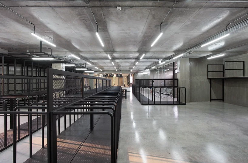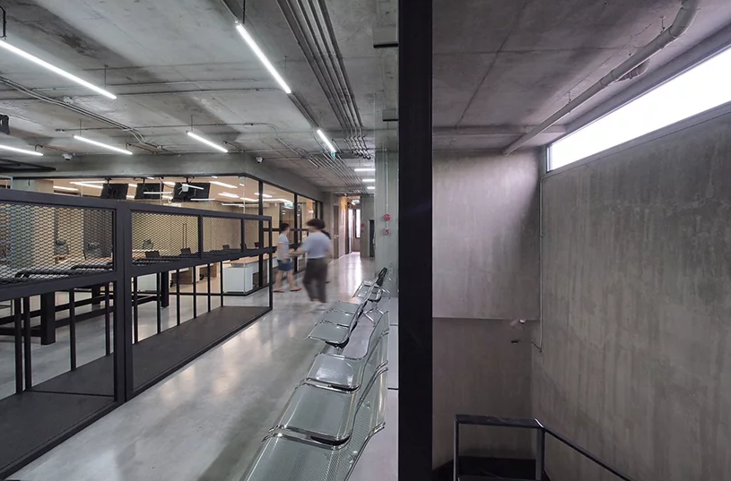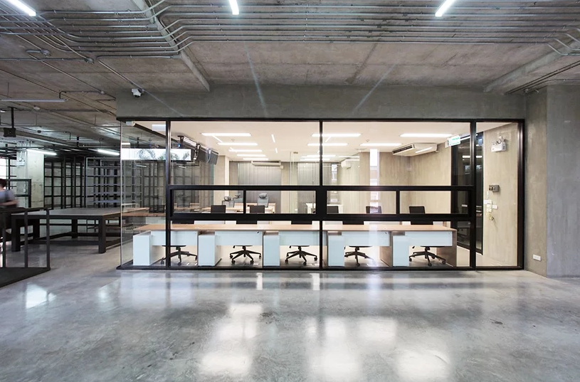 二樓辦公室裝修中充當皮革展示區(qū)和辦公空間。每層的窗戶隔片都是可以旋轉的,而且窗戶是凹進去的,這樣帶來的是間接的光線,不會損傷皮革制品。辦公區(qū)和展示區(qū)都是很寬大的,整體有著很濃的工業(yè)風格。