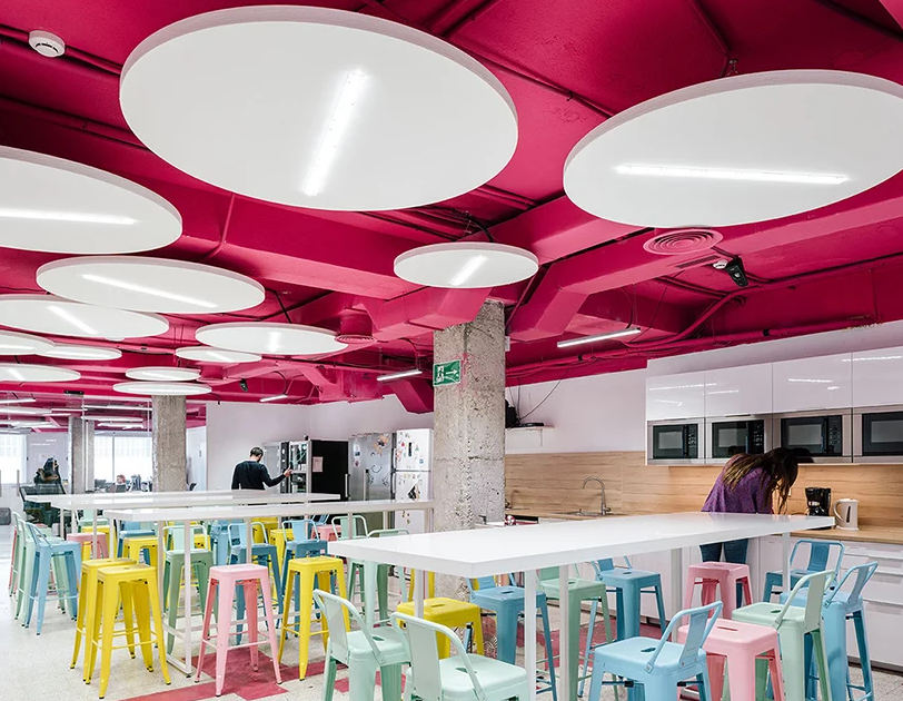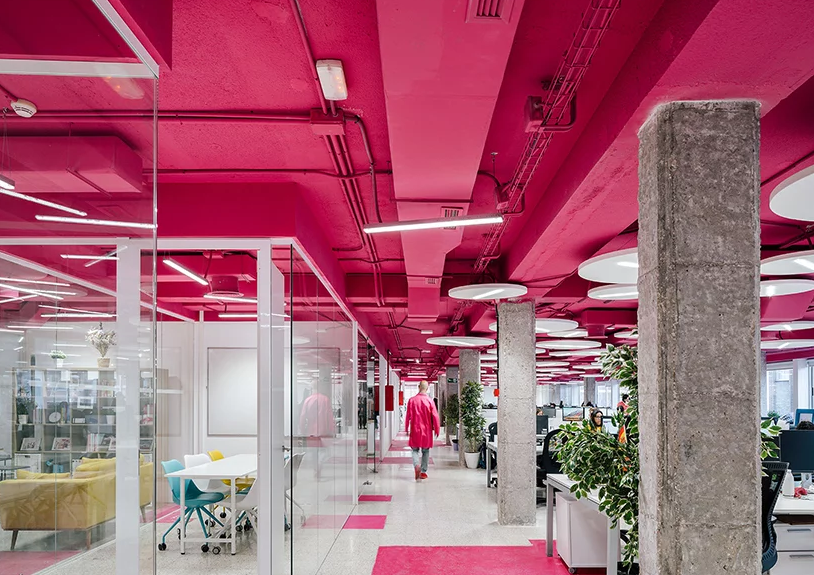 設(shè)計(jì)團(tuán)隊(duì)選擇通過(guò)應(yīng)用“歡樂(lè)的色彩”來(lái)活躍辦公室裝修效果。靈感來(lái)自建筑物的地下室,最近被涂成了明亮的檸檬黃,設(shè)計(jì)師決定將這種顏色的使用擴(kuò)展到所有樓層。