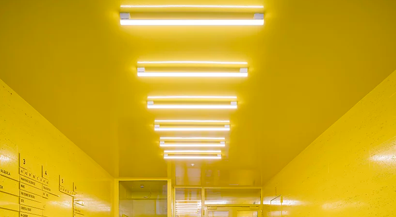從地下停車場(chǎng)開(kāi)始,黃色涂刷在所有的公共區(qū)和流通區(qū)域,只有現(xiàn)有的水磨石地板從大膽的色調(diào)中脫穎而出。不同的樓層有著不同的色調(diào),天花板上,燈具和周圍的白色墻壁突出。