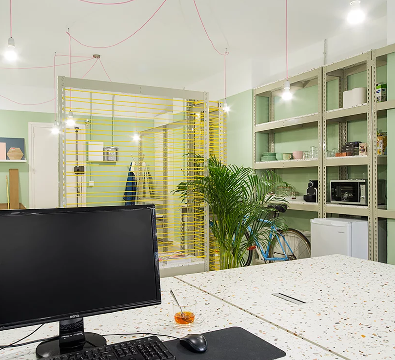 該工作室分為兩個區域:與入口接觸的會議室,以及位于房間后面并與自然光入口接觸的工作區。將這兩個區域分開,有一個鋼結構和紡織品穿插的分隔框,覆蓋了整個區域。辦公室的室內裝修采用了很多水磨石來裝飾,包括桌面,置物臺,前臺等等