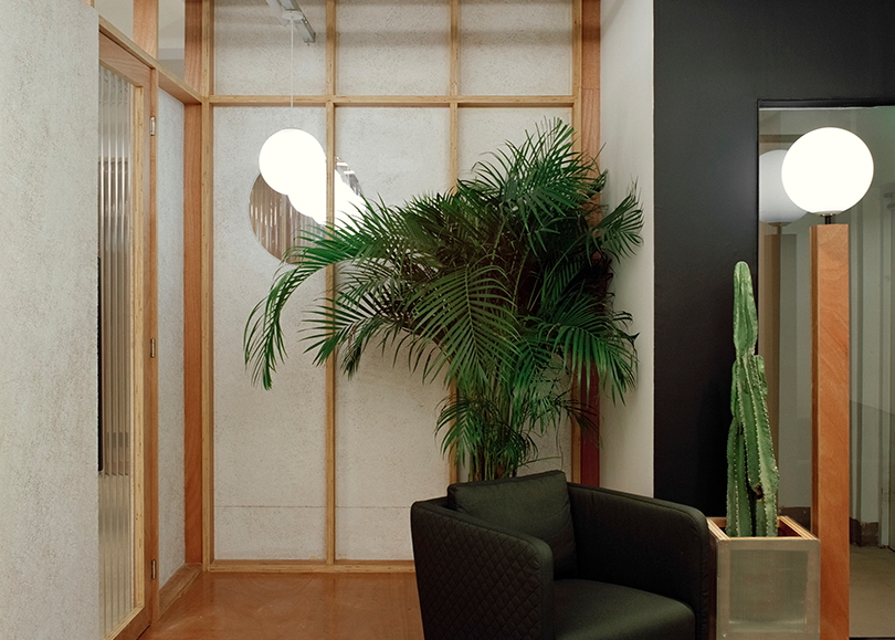 裝修以膠合板和混凝土為主要材料,完成了以幾何照明裝置和綠色植物為特色的室內(nèi)設(shè)計。聚碳酸酯隔板作為設(shè)計的主要組成部分,允許一個適合現(xiàn)代工作場所的透明環(huán)境。下面一起跟著