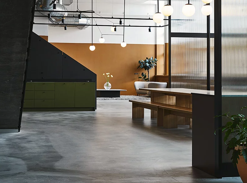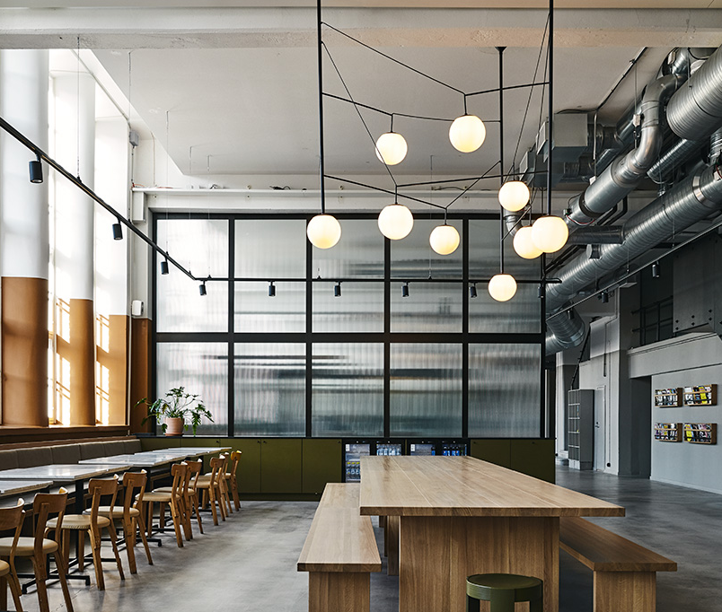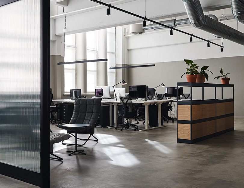 6米高的工業(yè)空間,辦公室裝修總面積1500平方米,分為公共和私人區(qū)域,以確保不同層次的互動(dòng)。在入口處,大堂和咖啡廳等公共空間鼓勵(lì)員工和顧客交往。會(huì)議室位于通向后方的長(zhǎng)廊上。這里和二樓閣樓上都是專(zhuān)門(mén)為員工提供的空間。