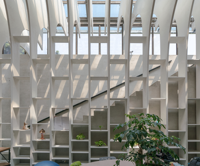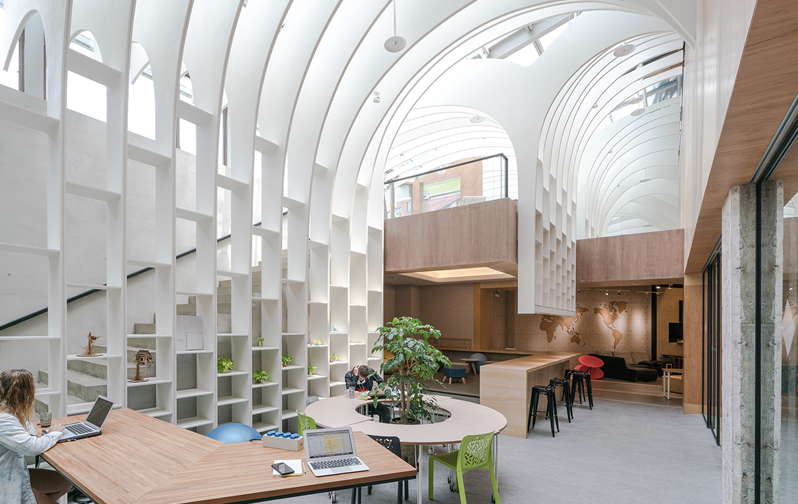 它是一個靈活的場所,可以根據(jù)用戶的不同需求進行調整-為工作,休息,會議,課程,或活動。白色的木板蜿蜒彎曲,形成空間的表皮,形成天花板、墻壁和架子的形狀。它們在暖色調的墻壁上拱起,劃分出不同空間的不同高度和層次,所有這些都在柔和的光線下擴散,形成一個有凝聚力的整體。