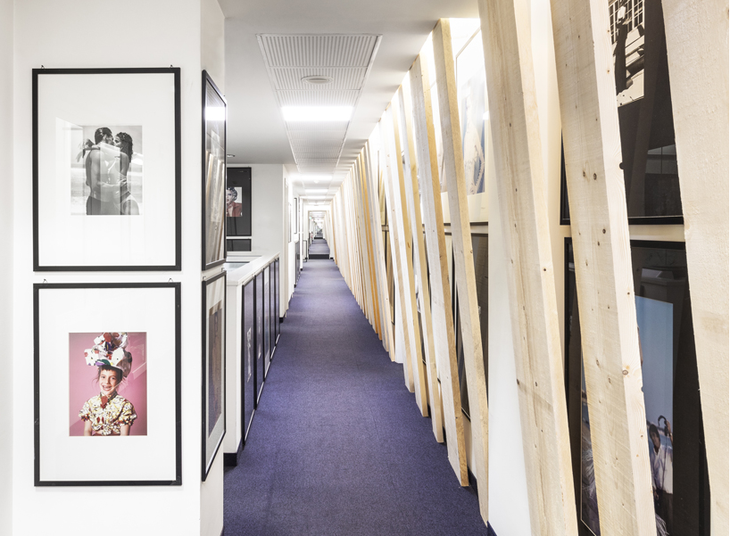 下面一個辦公室裝修是由,一長串樹脂木板以不均勻的間隔排列,它們靠在墻上,沿著過道延伸,就像人類的脊柱一樣,連接著一切。而這種辦公室裝修的一條狹長隧道,其中一面充滿了時尚歷史的圖像,被強烈的照亮。