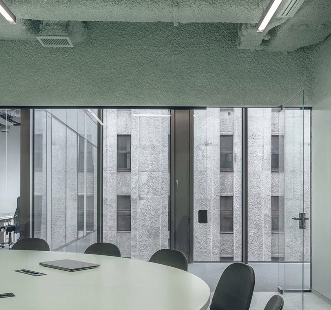 辦公室裝修采用的噴霧泡沫天花板和聲學面板墻被用來減輕聲音的傳輸和保持聲學的舒適性。而不是解決這與一般的聲學天花板瓷磚或擋板,聲學處理被整合為空間室內設計的一部分。辦公室裝修的隔音墻板采用條紋浮雕圖案,為內墻飾面提供尺度和節奏感,而辦公室裝修的天花板則采用整體方式,在某些情況下覆蓋所有機械設備,將它們變成懸掛的抽象物體,通常會被通用下降的天花板系統所掩蓋。