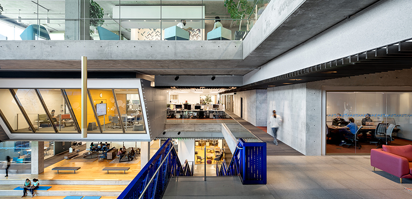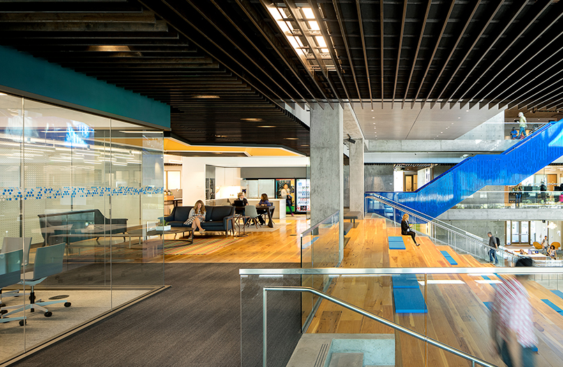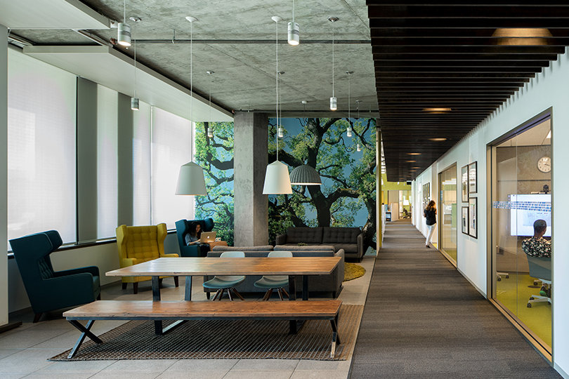 四層的辦公室裝修。在主中庭空間從校園的東、西兩側吸引活動,并作為MWB和大Intuit社區的中心。沿著中庭的每一個樓梯平臺和露天看臺直接連接到一個大的“起居室”,可以用餐也可以工作。辦公室裝修中除了陽臺和休閑軟家具設置等更為私密的突破空間,這些空間提供了一系列工作機會,沿著中庭周邊的各種程序功能有助于在整個工作日產生一致的活動。