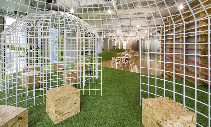 與暴露在外的混凝土地板形成鮮明對比的是,公司的標(biāo)志采用了多色條紋,展示了一個(gè)由一群五顏六色的人建造的地球儀。在其他地方的辦公室裝修設(shè)計(jì)中,類似鳥籠的結(jié)構(gòu)提供了非公開會議室的替代方案,并且可以移動以適應(yīng)各種情況。